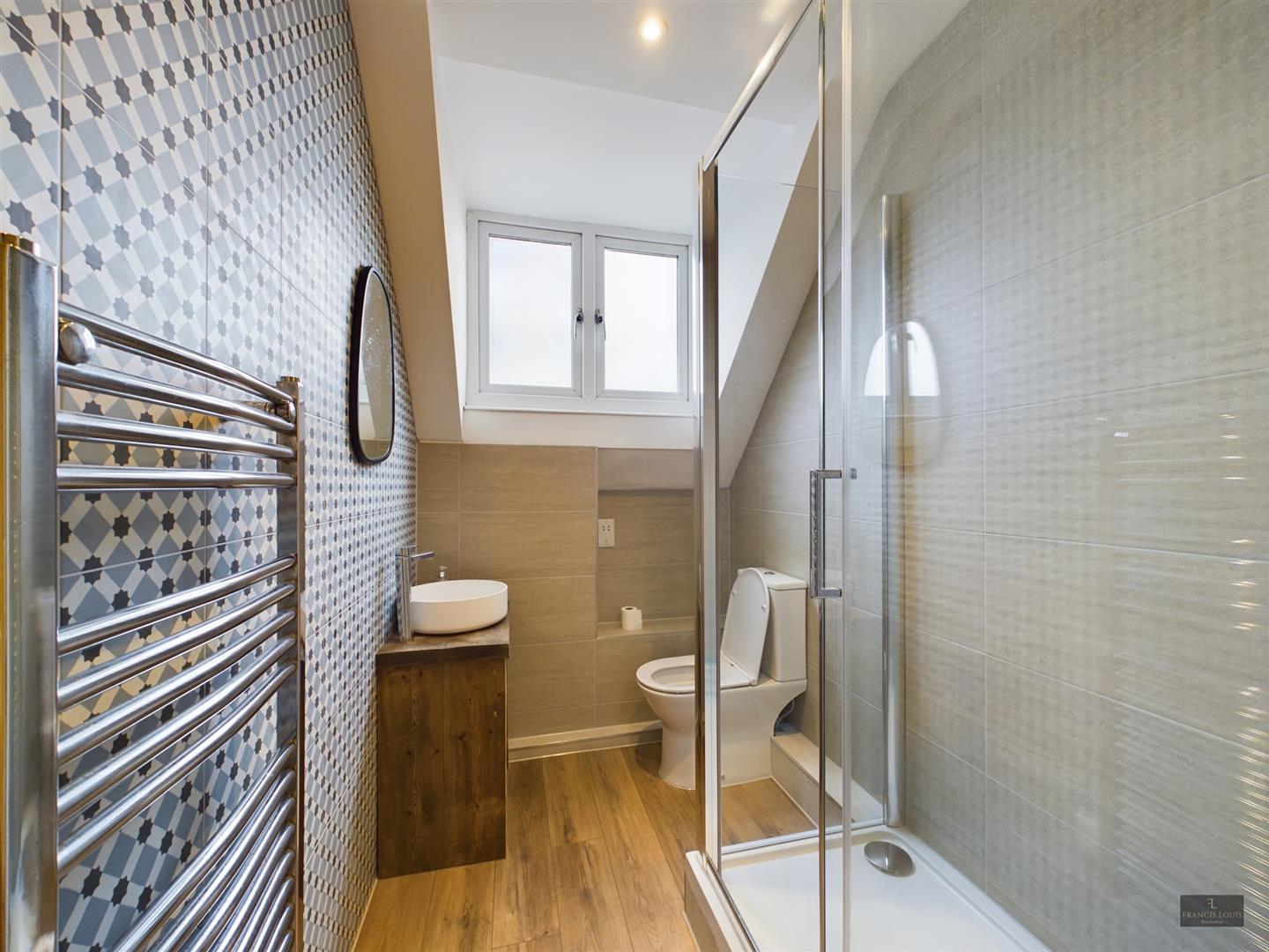 A panel bath with shower over, a low level w/c, a wash hand basin, radiator,